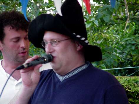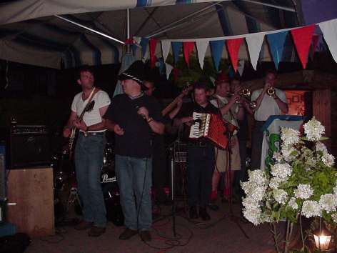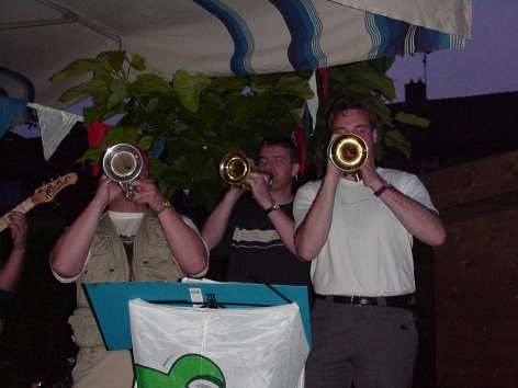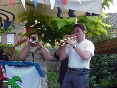 Deze foto's zijn gemaakt op 27-july-2000. Er was een tuinfeest bij het jonge echtpaar Meinders. Wij moesten er spelen anders zouden zij het bruiloftsgeschenk van de Jub-commissie niet krijgen of zoiets. De Jub-commissie organiseert elk jaar Respekt veur 't Dialekt. Een groot muziekfestijn tijdens koninginnedag in Denekamp. Zowel het Respekt veur 't Dialekt-gebeuren alsmede dit tuinfeest was weer supergezellig. Wie de foto's heeft gemaakt is ons niet bekend. "Mer 't was ne mooi'n oamd."